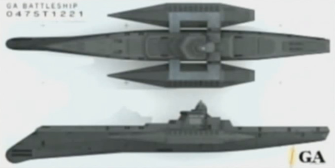 Battleships are seldom encountered compared to smaller warships, although they are significantly more powerful. They carry impressive firepower for their classification, including a trio of large naval gun-turrets, mounted two forward and one rear, as well as two large spread missile arrays mounted on the trimaran-like pods on either side of the ship. Their powerful long-range weaponry makes them a significant threat to a lesser-skilled NEXT pilot, often able to stun them with the impact of their cannon fire. Despite their firepower, Battleships are armored only slightly better than Normals, and can typically be destroyed by several hits from most laser blades and grenade cannons.