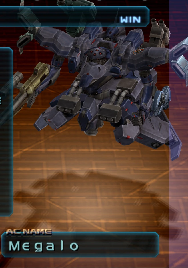 Megalo is a lightweight hover AC equipped with an exceed orbit core, back booster extensions, napalm rockets, back mounted rocket launchers, a sniper rifle and laser blade. The unit is built for fast paced mid and close range combat.