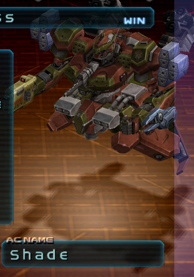Cypress uses a hover type Crest AC that specializes in shell damage. The unit is equipped with an Overboost core, anti missile extensions, two identical chainguns on both back weapon slots, a high-heat round handgun and a laser blade. His AC is composed of an amalgamation of Crest equipment, making it well-balanced and suited to a variety of combat styles. Due to the unit being equipped with OP-INTENSIFY it can fire blade waves and use the chainguns while moving.
