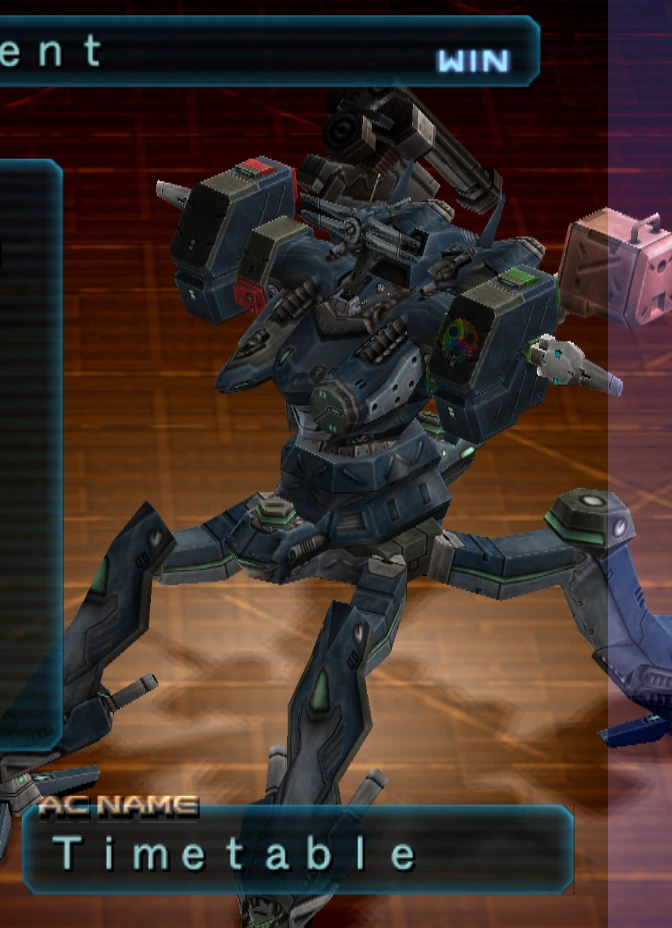 Timetable is a middleweight quadruped AC equipped with an exceed orbit core, anti-missile extensions, a back mounted chain gun, back mounted missile launcher and missile launcher arms.