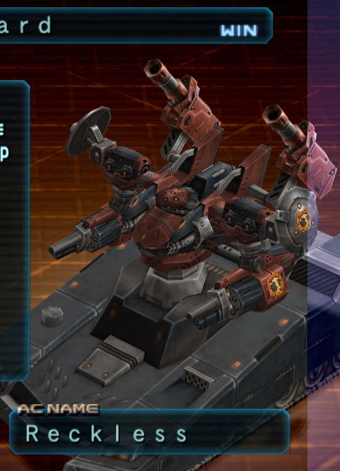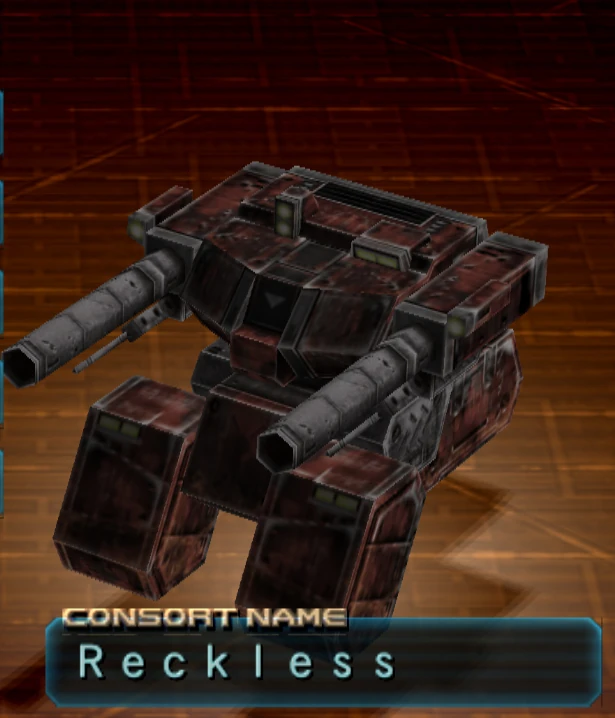 Reckless (known as Cigarette in Japanese, シガレット shigaretto) is a middleweight tank AC equipped with an overboost core, side shield extensions, dual back mounted grenade launchers, and howitzer weapon arms.