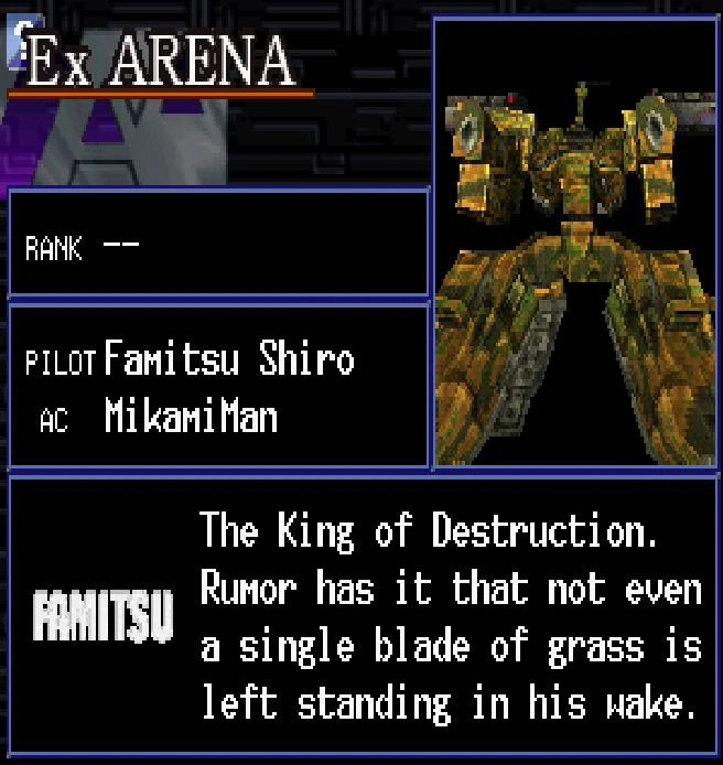 Famitsu Shiro is a Raven that appears in the Armored Core: Master of Arena Extra Arena. He is a member of the Guest Arena.