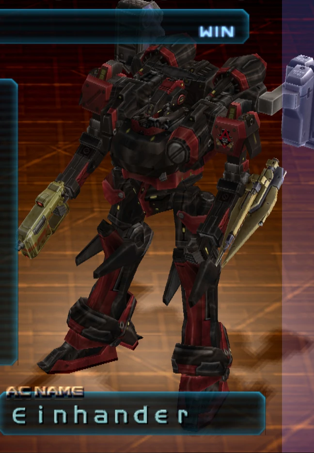 Fixer is one step up from the other Arena rankers up to this point. Unlike majority of the Arena rankers, Fixer is actually smart enough to know when to maintain a distance and when to close it, and his weapon usage corresponds to the range at which he is fighting; this means he will keep at a distance when using his missiles, and close the distance when using his handgun. In addition, he will also boost and jump around constantly to avoid enemy fire, making him no easy foe by any means. Do not be fooled by his AC frame, Einhander has the mobility to outspeed and outmaneuver slower ACs. It is also armed with the strongest laser blade, so entering melee range is not advised.