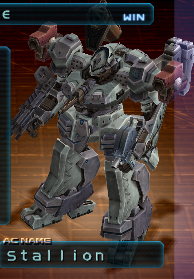 Impulse is not to be underestimated, he puts up a decent fight every time. Stallion is a heavyweight bipedal AC equipped with an overboost core, turn booster extensions, a multi missile launcher, a large rocket launcher, a howitzer and the largest physical blade. The damage potential on this AC is fairly high. The AC is pretty well armored and can move fairly quick with its overboost core.