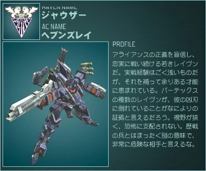 - The Japanese bio for him adds that many of Vertex Ravens had fallen to his blade, as proof of his piloting talent. He is also stated to be very focused and is not controlled by fear.