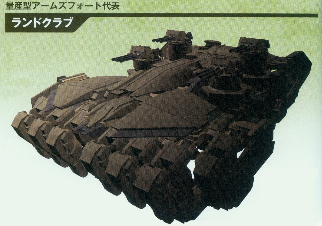 Land Crabs are mass-produced Arms Forts manufactured by Global Armaments. The name comes from how the AF transforms into a multi-legged, crab-like form for battle or crossing difficult terrain. In this state, eight front legs and four rear legs may be used to move forward, backward, left, and right; otherwise, a Land Crab moves mainly through its continuous tracks.[1]