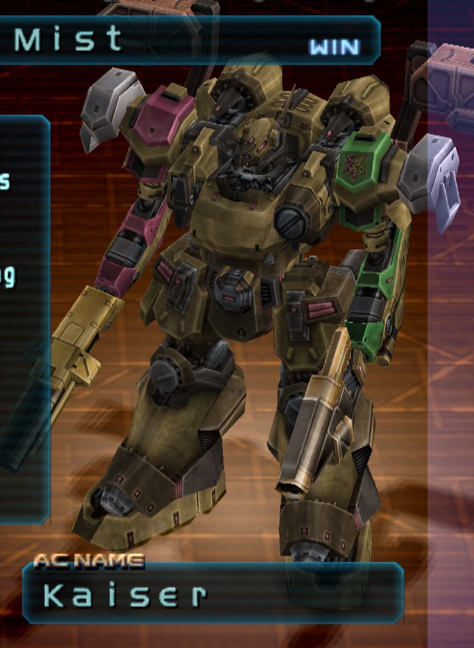 Kaiser is an exceptionally well-armored heavyweight bipedal Armored Core built to inflict incredible amounts of force as quickly as possible. The unit is armed with an energy-based Exceed Orbit core, a spread-shot howitzer, a double-barrel shotgun, interlocking missile extensions, and a back-mounted dual missile launcher double back weapon. Its mobility and energy capacity are also improved by OP-INTENSIFY.