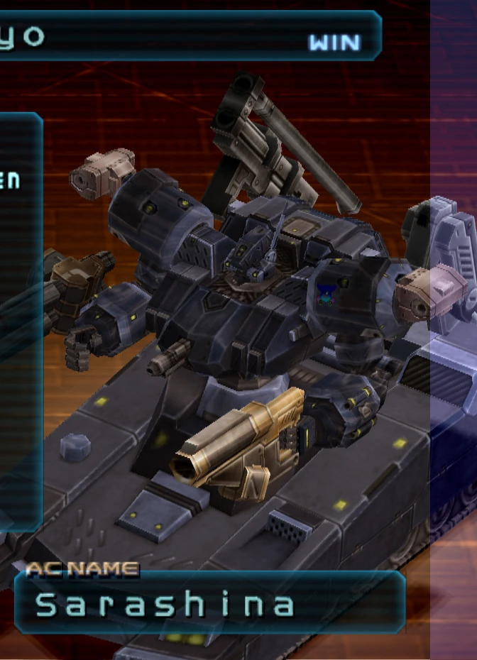 Facing Tsukuyo in a heavy tank or heavy bipedal AC is pretty much suicide, as his weapons can easily hit slower moving targets, so using an AC with high mobility is advised. His weapons, although hard hitting, aren't exactly fast-firing, so high mobility can definitely help in avoiding his attacks and also being able to outmaneuver him. Tsukuyo's arm weapons are less dangerous (especially since neither of them can lock-on) compared to his back loadout, so staying near him constantly on the move is favourable. Since Sarashina has limited mobility, rapid-fire weapons like machine guns or even the KARASAWA work great against him. Missiles are also a viable way of defeating him, but do note that Sarashina has high endurance, so you will likely require another weapon to back them up.