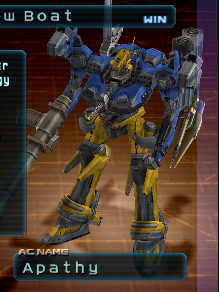 Apathy is a middleweight AC equipped with an overboost core, anti missile extensions, a back mounted radar, back mounted laser cannon, bazooka, and MOONLIGHT laser blade. Its mainstay weapons are its bazooka and laser cannon. This AC is overweight and slow as a result. Due to the lack of OP-INTENSIFY enhancements, this AC is a small threat to a fairly maneuverable AC.